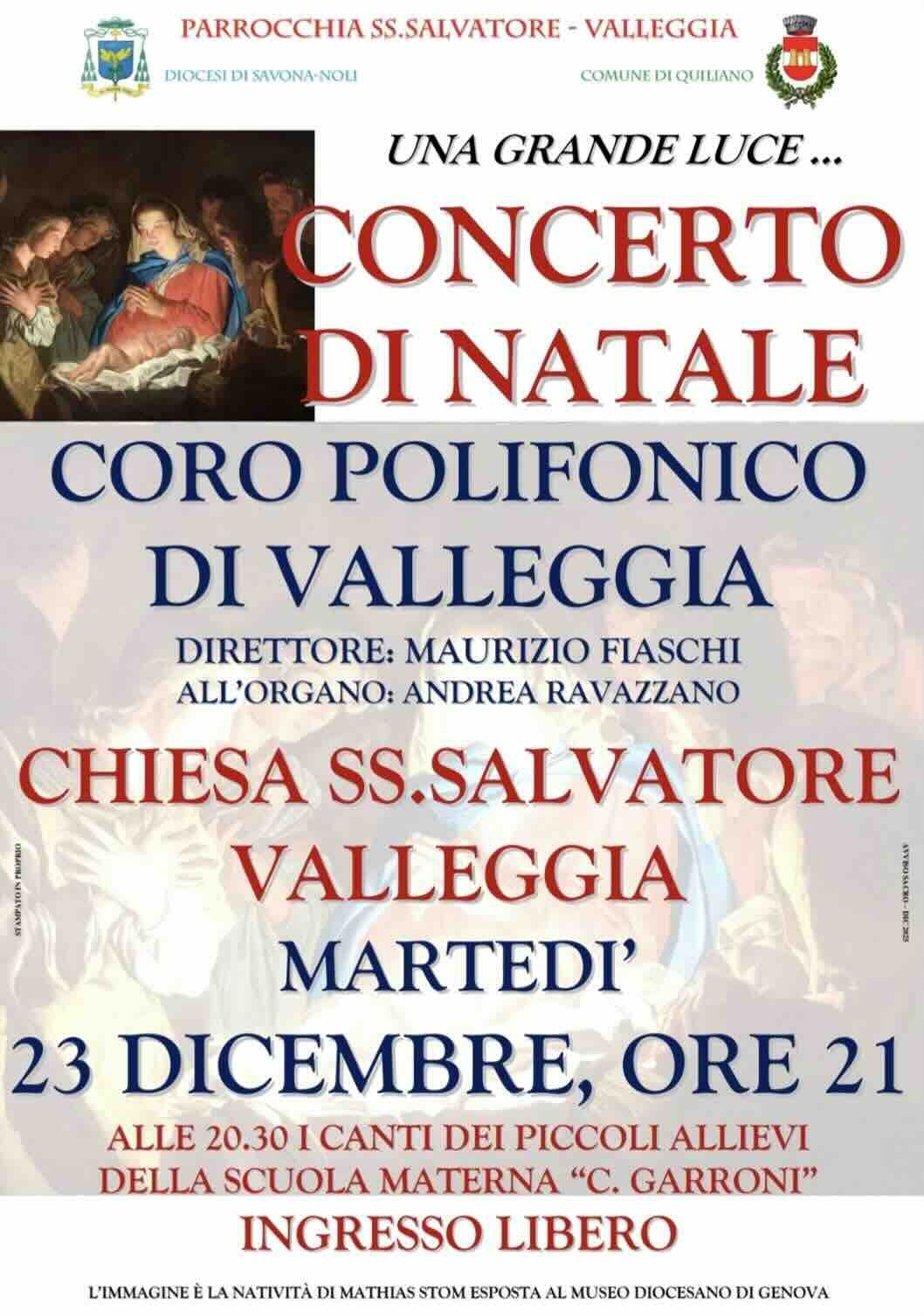 Quiliano. Grandi novità nella tradizione stasera (martedì 23 dicembre) alle ore 21 a Valleggia nella chiesa del Santissimo Salvatore con il concerto di Natale del Coro Polifonico di Valleggia, diretto da Maurizio Fiaschi. Nella serata, come sempre, notissime melodie della tradizione natalizia – fra diversi Paesi, lingue e periodi storici – ma anche due brani di assoluto valore del Barocco musicale: il “Magnificat” di Francesco Durante (in esecuzione integrale) e il “Gloria” di Antonio Vivaldi (di cui verranno proposti numerosi brani). Ad accompagnare il coro saranno Andrea Ravazzano all’organo e il quartetto d’archi “Camillo Sivori” di Finale Ligure, composto da Constantin Ciobanu, Angela Zapolla, Maddalena Vitali e Daniele Canepa.