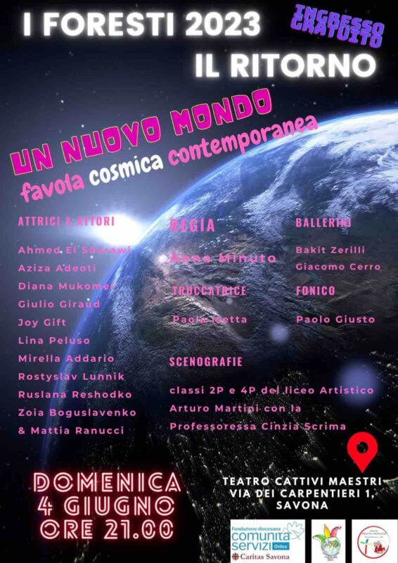Savona. Domenica 4 giugno alle ore 21 alle Officine Solimano, nel teatro dei Cattivi Maestri, in via dei Carpentieri 1, la compagnia I Foresti rappresenterà lo spettacolo “Un nuovo mondo”, una “favola cosmica contemporanea” diretta dalla regista Anna Minuto.