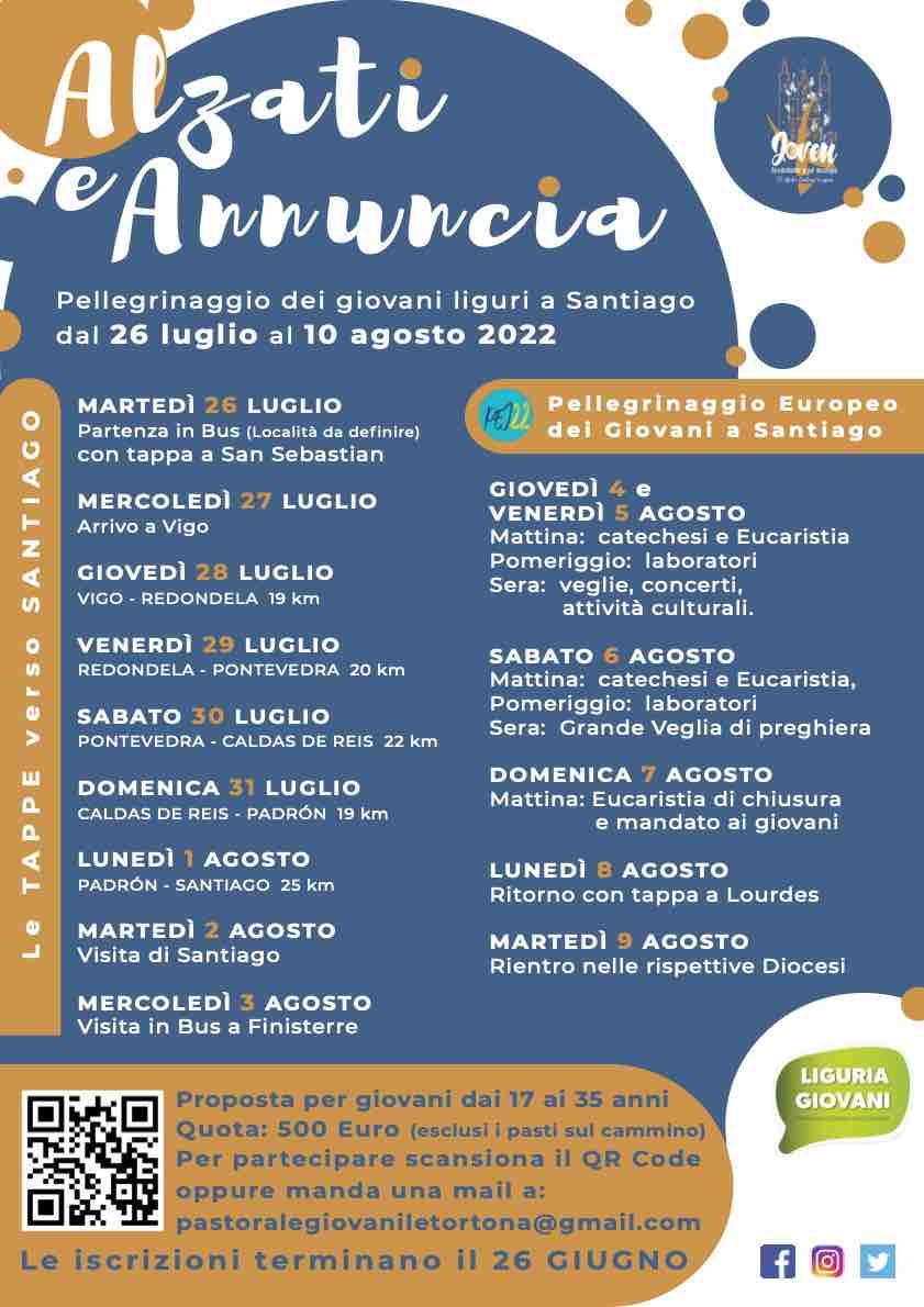 Dal 26 luglio al 2 agosto le diocesi liguri organizzano un pellegrinaggio con i giovani a Santiago de Compostela, in Spagna, sul tema “Alzati e annuncia”. Si percorrerà il Cammino Portoghese, una delle vie che compongono il Cammino di Santiago de Compostela, da Vigo al capoluogo della comunità autonoma della Galizia. Parallelamente dal 3 al 7 agosto nella città del santo la Pastorale Giovanile spagnola organizza il Pellegrinaggio della Gioventù Europea per compiere un cammino insieme verso la tomba dell’apostolo Giacomo. L’ultimo è stato nel 2010.