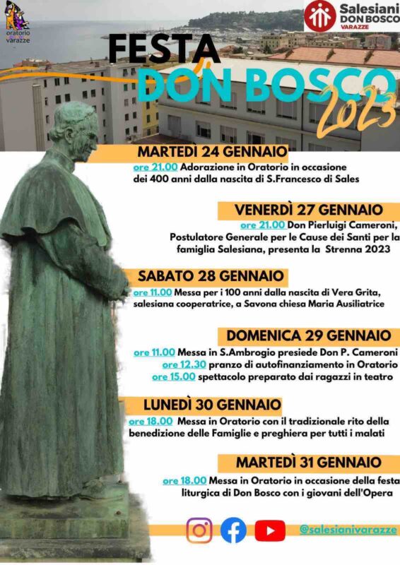 Lunedì 30 gennaio alle 18 nell’oratorio salesiano varazzino sarà celebrata la messa con il tradizionale rito della benedizione delle famiglie e la preghiera per tutti i malati. Infine martedì 31 gennaio alle 18 in oratorio sarà officiata la messa in occasione della memoria liturgica di san Giovanni Bosco con i giovani dell’Opera Salesiana.