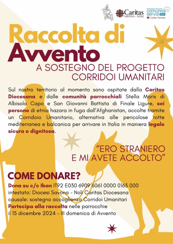 Domenica 15 dicembre, terza di Avvento, nelle parrocchie della diocesi di Savona-Noli sarà possibile sostenere con una raccolta fondi il progetto “Corridoi Umanitari” di Caritas Italiana e Fondazione Migrantes per l’accoglienza, anche in diocesi, di donne, uomini e bambini stranieri in situazioni di pericolo, spesso in fuga da molti anni, rifugiatisi nei campi profughi di Paesi limitrofi a quelli di appartenenza. Una forma di intervento che è molto più di un modo sicuro e dignitoso per fuggire da contesti difficili.