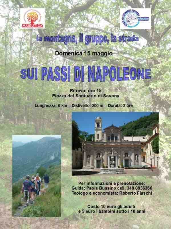 Savona. Prosegue il progetto “La montagna, il gruppo, la strada”, promosso dall’Ufficio Pellegrinaggi e Pastorale del Tempo libero, del Turismo e dello Sport della Diocesi di Savona-Noli e dall’associazione Maieutica per far conoscere il territorio dal punto di vista culturale, storico, religioso e naturalistico. Domenica 15 maggio si terrà l’escursione “Sui passi di Napoleone”: 3 ore di trekking lungo un percorso di 6 km e con un dislivello di 200 metri. Il ritrovo sarà alle 15 in piazza Santuario, il costo 10 € per gli adulti e 5 € per i bambini sotto i 10 anni. Per informazioni e prenotazioni è possibile contattare la guida Paola Bussino al numero di cellulare 3490936366.