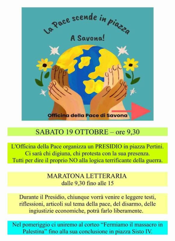 Savona. Sabato 19 ottobre in piazza Sandro Pertini, attigua all’ex Ospedale San Paolo, il gruppo Officina della Pace manifesterà con il presidio dal titolo “La Pace scende in piazza a Savona” per dire il proprio “No!” alla logica terrificante della guerra. Ci sarà chi digiuna e chi protesterà semplicemente con la sua presenza.