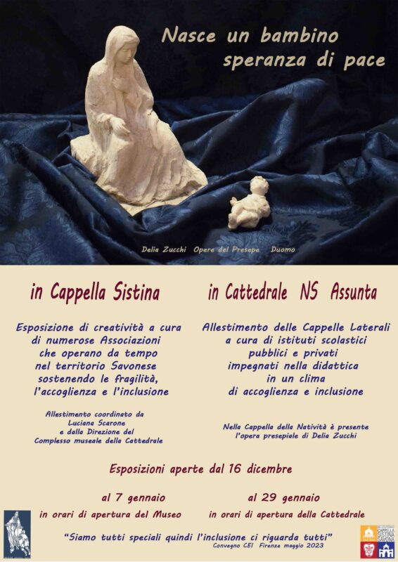 Venerdì 22 dicembre alle ore 10:30 nella Cattedrale Nostra Signora Assunta di Savona il vescovo Calogero Marino presenzierà all’inaugurazione dei presepi che otto tra scuole pubbliche e paritarie hanno allestito nelle cappelle laterali nell’ambito di “Nasce un bambino, speranza di pace”. L’iniziativa è promossa dal Complesso Museale della Cattedrale e condivisa dall’Ufficio per la Pastorale Scolastica per celebrare l’ottavo centenario del primo presepe a Greccio ad opera di san Francesco d’Assisi.
