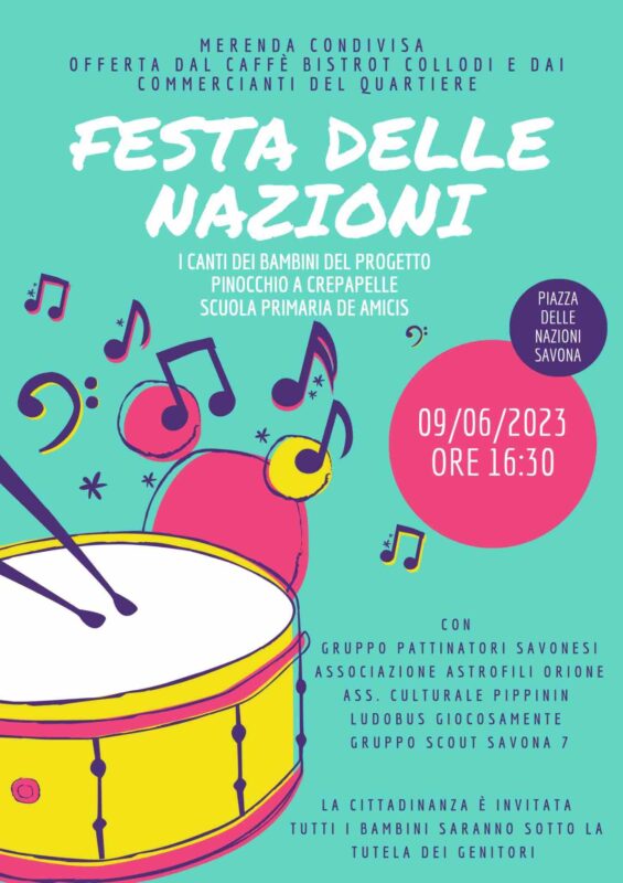 Savona. Venerdì 9 giugno dalle ore 16:30 in piazza delle Nazioni si terrà la “Festa delle Nazioni” con il gruppo scout Savona 7, il Gruppo Pattinatori Savonesi, l’Associazione Astrofili Orione, l’Associazione Culturale Pippinin e Ludobus Giocosamente.