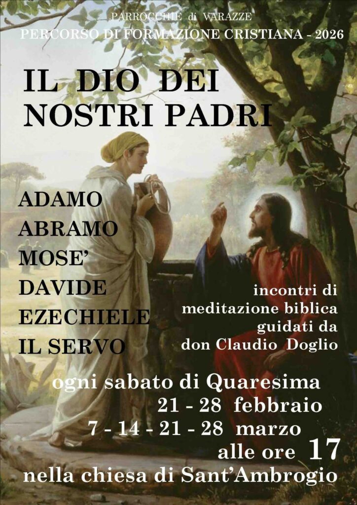 Anche quest’anno le parrocchie di Varazze promuovono per la Quaresima un percorso di formazione cristiana tenuto da don Claudio Doglio sotto il titolo generale “Il Dio dei nostri padri”. Il tema saranno le figure bibliche dell’Antico Testamento che caratterizzano le prime letture delle domeniche di Quaresima nell’anno A, rilette alla luce di Cristo e del Nuovo Testamento.