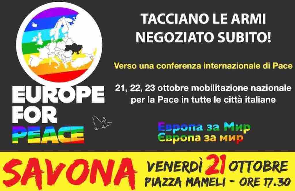 Savona. Venerdì 21 ottobre dalle ore 17:30 in piazza Goffredo Mameli si terrà un presidio per chiedere la messa al bando delle armi nucleari, il cessate il fuoco immediato tra Russia e Ucraina e più in generale di fermare tutti i conflitti oggi presenti sul pianeta. La manifestazione sarà formata dalle principali associazioni antifasciste del territorio e alle organizzazioni che promuovono la pace, tra cui ACLI, Caritas e Comunità di Sant’Egidio, e in preparazione a quella nazionale del 5 novembre a Roma.