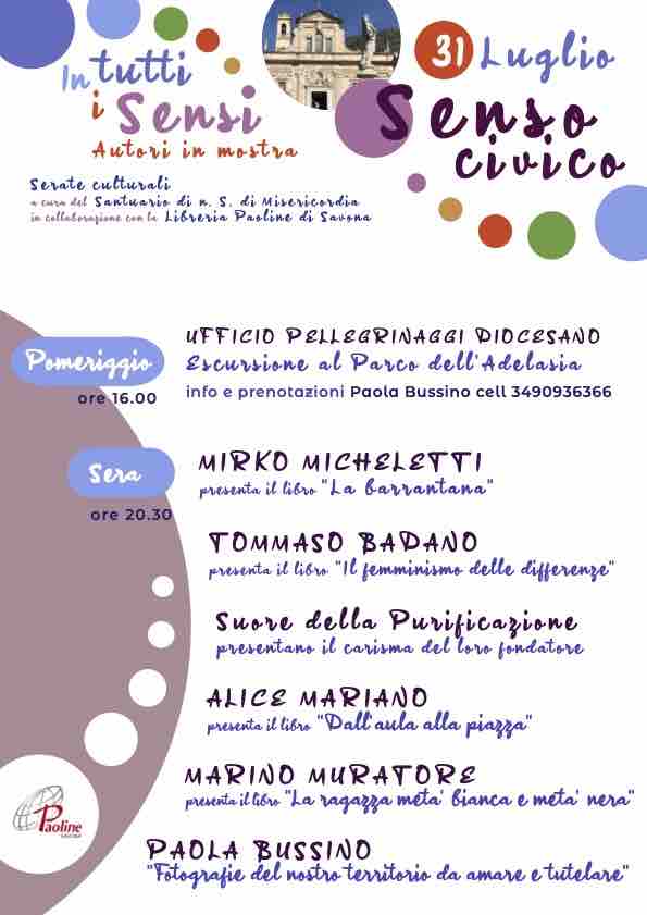 Savona. Sensus fidei, tatto, vista, udito: l’ultimo “senso” del progetto culturale “Autori in mostra” che ancora rimane da scoprire è il “Senso Civico”. Ne avremo l’occasione lunedì 31 luglio al Santuario Nostra Signora di Misericordia. L’iniziativa fa parte del ciclo “In tutti i sensi” organizzato dallo stesso Santuario in collaborazione con la Libreria Paoline.