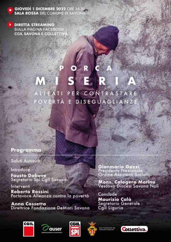 Savona. Giovedì 1 dicembre alle ore 15:30 nella Sala Rossa del Municipio, in piazza Sisto IV, e sulle pagine Facebook della CGIL Savona e di Collettiva si terrà il convegno dal titolo “Porca miseria – Alleati per contrastare povertà e diseguaglianze”, a cui interverrà anche il vescovo Calogero Marino.