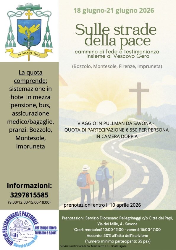 “Sulle strade della pace – Cammino di fede e testimonianza insieme al Vescovo Gero (Bozzolo, Montesole, Firenze, Impruneta)” è il titolo del viaggio che il Servizio Pellegrinaggi della Diocesi di Savona-Noli sta organizzando per il periodo tra il 18 e il 21 giugno. La quota di partecipazione ammonta a 550 € a persona e comprende sistemazione in hotel in mezza pensione (camera doppia), viaggio in pullman, assicurazione medico / bagaglio, pranzi a Bozzolo, Montesole e Impruneta.