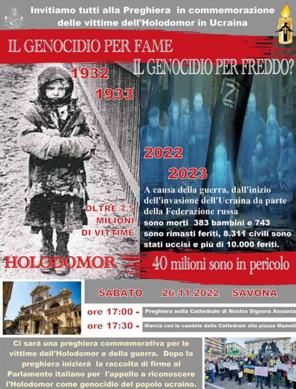 Sabato 26 novembre la comunità ucraina di Savona promuove l’iniziativa “Il genocidio per fame, il genocidio per freddo?” in ricordo delle vittime dell’Holodomor e dell’attuale conflitto contro la Russia. Nella Cattedrale Nostra Signora Assunta sarà visitabile una mostra tematica e si terranno alle ore 17 una preghiera commemorativa e a seguire una raccolta di firme da indirizzare al Parlamento italiano per il riconoscimento del genocidio.