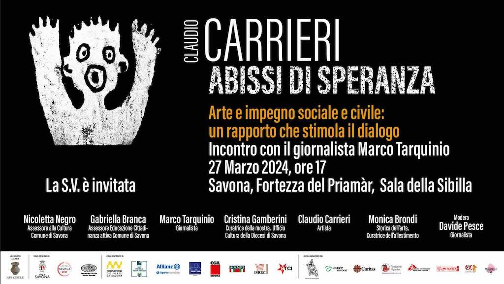 Nell’ambito della mostra mercoledì 27 marzo alle ore 17 nella Sala della Sibilla della Fortezza del Priamàr si terrà la conferenza su “Arte e impegno sociale e civile: un rapporto che stimola il dialogo”. Come i fatti della contemporaneità sono oggetto dell’arte del nostro tempo? In che modo i media possono favorire e promuovere arte e impegno sociale favorendo dialogo e coesione sociale? Questi alcuni degli interrogativi che si porranno Marco Tarquinio, editorialista di Avvenire e uno dei vicepresidenti della Società Dante Alighieri, e lo stesso Claudio Carrieri.