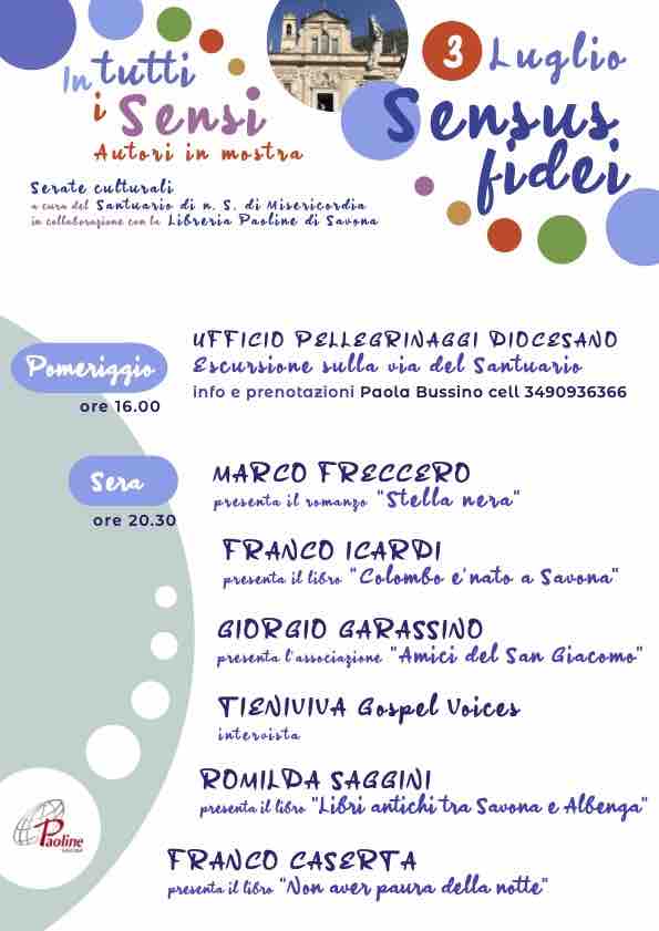 Savona. Nell’ambito del progetto di partecipazione culturale attiva “Autori in mostra” e in collaborazione con la Libreria Paoline tutti i lunedì di luglio il Santuario Nostra Signora di Misericordia invita alle serate “In tutti i sensi”. Il gruppo di circa sessanta artisti che fa riferimento alla libreria intende promuovere così le sue opere. “Per crescere nella propria umanità ogni individuo necessita di ascoltare le persone con le quali vive e raccontarsi a loro – affermano gli organizzatori – Questa reciprocità permette di costruire comunità accoglienti. Attraverso un metodo che si sta via via consolidando gli autori si propongono in luoghi della città che s’intende valorizzare, coinvolgendo il pubblico in una riflessione sul senso della vita”.