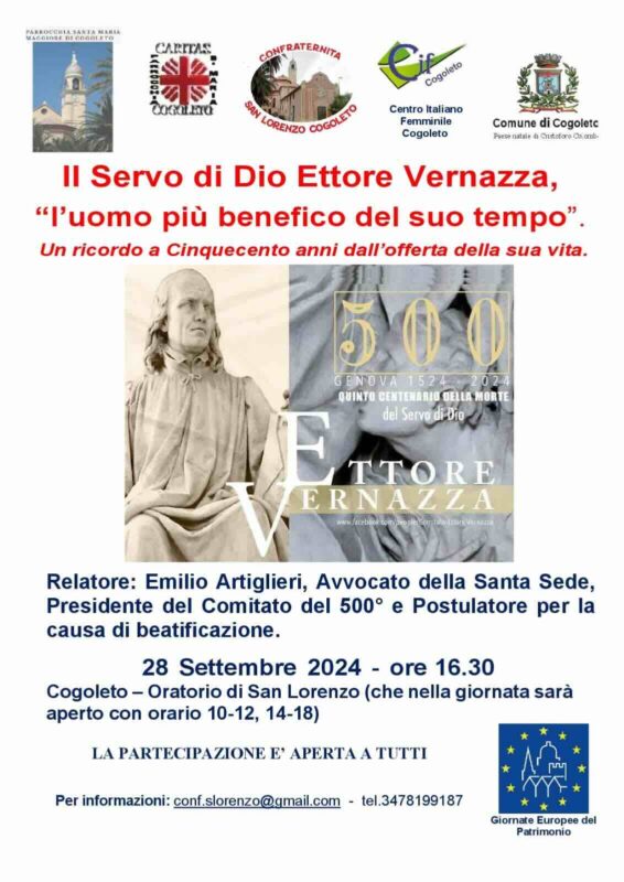 Sabato 28 settembre alle ore 16:30 l’Oratorio San Lorenzo di Cogoleto (che nella giornata sarà aperto con orario 10 – 12 e 14 – 18) ospiterà la lectio magistralis “Il Servo di Dio Ettore Vernazza, ‘l’uomo più benefico del suo tempo’. Un ricordo a cinquecento anni dall’offerta della sua vita” di Emilio Artiglieri, avvocato della Santa Sede, presidente del comitato del 500esimo anniversario e postulatore per la causa di beatificazione. La conferenza avrà lo scopo di far conoscere una figura nota per lo più solo perché gli è stata dedicata una via a Cogoleto, Arenzano e Genova e che in realtà fu un precursore della sanità pubblica, della Caritas e della cura a dell’attenzione agli ultimi della società. L’evento è promosso dalla Parrocchia Santa Maria Maggiore, dalla Caritas Parrocchiale Santa Maria, dalla Confraternita San Lorenzo, dal Centro Italiano Femminile e dal Comune. Per informazioni è possibile telefonare al numero 3478199187 o scrivere un’e-mail all’indirizzo conf.slorenzo@gmail.com.