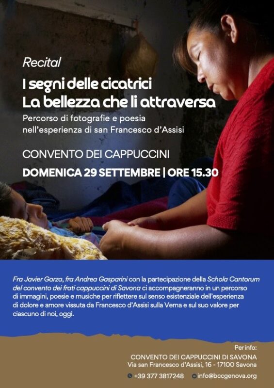 Domenica 29 settembre alle ore 15:30 nel Convento dei Frati Minori Cappuccini, in via san Francesco d’Assisi 16, nel quartiere Villetta, a Savona andrà in scena il recital “I segni delle cicatrici. La bellezza che li attraversa. Percorso di fotografie e poesia nell’esperienza di san Francesco d’Assisi”. Dal 2023 al 2026 la famiglia francescana celebra l’ottavo centenario del dono delle stimmate: sono infatti passati otto secoli dagli avvenimenti che hanno cambiato la vita del “poverello” e con lui il corso della storia di migliaia di persone di ogni epoca e parte del mondo.