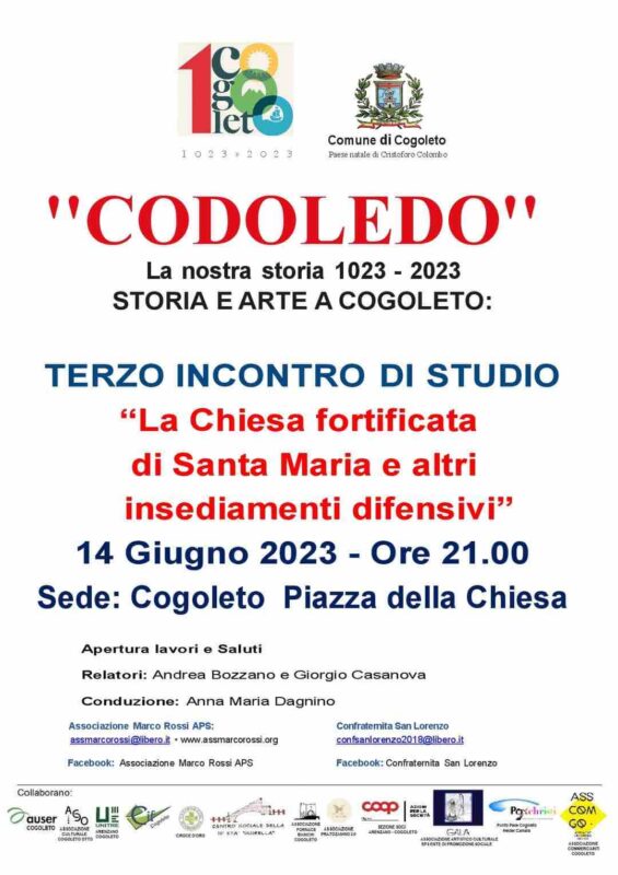 I relatori Andrea Bozzano e Giorgio Casanova illustreranno anche alcune novità da ricerche d’archivio. Modererà Anna Maria Dagnino. L’evento sarà il terzo appuntamento del ciclo storico artistico “Cogoledo. La nostra storia 1023 – 2023” e in caso di maltempo si svolgerà in chiesa.