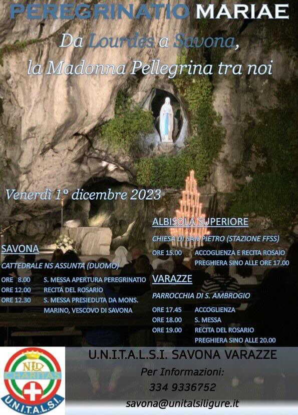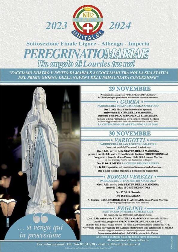 In occasione dei suoi 120 anni di fondazione l’UNITALSI Unione Nazionale Italiana Trasporto Ammalati a Lourdes e Santuari Internazionali organizza l’evento “Peregrinatio Mariae. Un angolo di Lourdes tra noi” con una statua della Madonna dal santuario occitano, partita il mese scorso dalla Francia nel segno della frase “Che si venga qui in processione”, pronunciata dalla Vergine alla pastorella Marie Bernarde Soubirous. Si comincerà mercoledì 29 novembre alle ore 21 a Gorra, frazione di Finale Ligure, con la processione aux flambeaux, che partirà da piazza san Bartolomeo e arriverà nella chiesa dedicata all’apostolo, dove verrà celebrata la messa e che sarà aperta fino a mezzanotte.