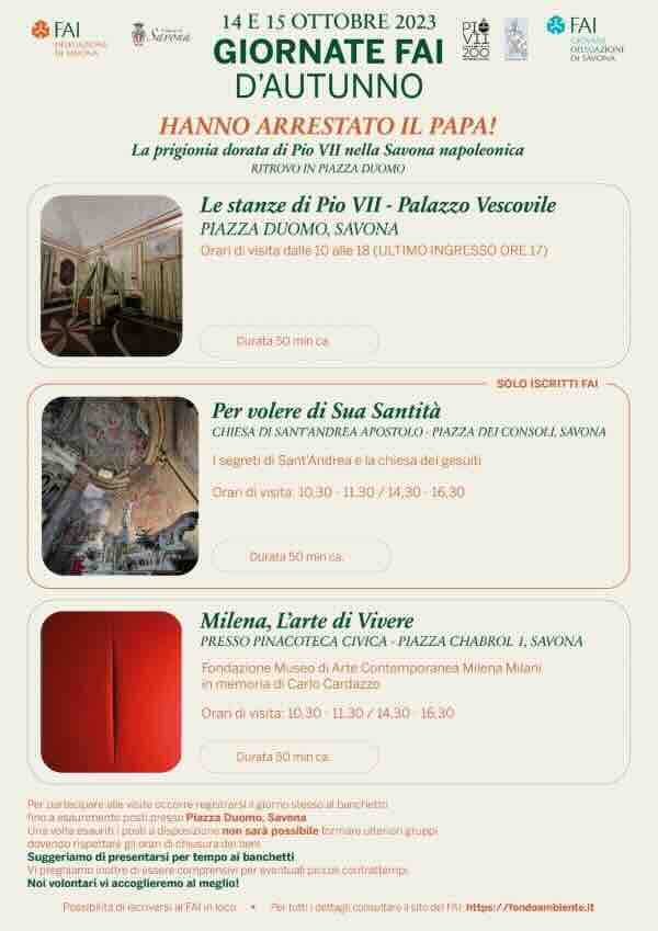 Savona. Sabato 14 e domenica 15 ottobre due patrimoni storico artistici della diocesi di Savona-Noli saranno al centro delle Giornate FAI d’Autunno: gli Appartamenti di papa Pio VII e la Chiesa Sant’Andrea Apostolo. Da tempo sono in aumento le visite ai due “scrigni” culturali, che offrono particolari visioni storico artistiche e insospettabili sorprese. Le guide del Fondo Ambiente Italiano organizzeranno visite che partiranno da piazza del Duomo, in particolare negli spazi porticati di Palazzo Della Rovere. Anche la Collezione Milena Milani nella Pinacoteca Civica di Savona sarà un’eccellenza FAI in città.