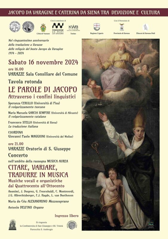Varazze. Nel 50esimo anniversario della traslazione delle reliquie del beato Jacopo da Varagine (1974-2024) sabato 16 novembre alle ore 16 nella Sala Consiliare del Municipio avrà luogo la tavola rotonda “Le parole di Jacopo – Attraverso i confini linguistici”. L’evento è organizzato dal Centro Studi Jacopo da Varagine e dall’Associazione Internazionale Caterinati con il contributo di Fondazione Agostino De Mari e KWB Torino e il patrocinio di Regione Liguria, Provincia di Savona e Diocesi di Savona-Noli.