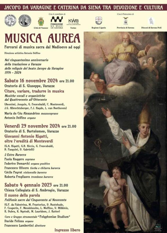 Nel contesto dell’anniversario e del quarto centenario della proclamazione di santa Caterina da Siena e dello stesso beato a patroni della città si terrà la rassegna “Musica aurea – Percorsi di musica sacra dal Medioevo ad oggi”, ispirata alla maggiore opera del beato Jacopo. Il 16 novembre alle ore 21 nell’Oratorio San Giuseppe il concerto “Citare, variare, tradurre in musica” comprenderà musiche vocali e organistiche dal Quattro all’Ottocento e avrà per protagonisti il mezzosoprano Maria do Céu Alexandrino e l’organista Antonio Delfino.