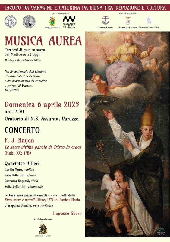 Varazze. Domenica 6 aprile alle ore 17:30 all’Oratorio Nostra Signora Assunta il Quartetto Alfieri, formato da Davide Moro e Sara Bellettini ai violini, Costanza Negroni alla viola e Sofia Bellettini al violoncello, eseguirà “Le sette ultime parole di Cristo in croce” di Franz Joseph Haydn (1732 – 1809) nella versione per quartetto d’archi. Il concerto è in sintonia con il tempo della Quaresima e aprirà la seconda edizione del ciclo “Musica Aurea”, organizzato dal Centro Studi Jacopo da Varagine nell’ambito celebrazioni per il quarto centenario dell’elezione di santa Caterina da Siena e del beato Jacopo da Varagine a patroni della città (1625).
