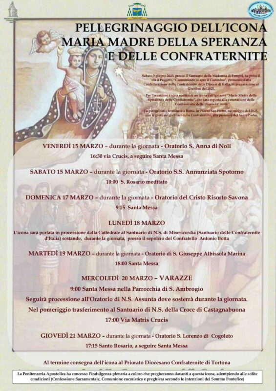 Il Priorato e gli oratori delle confraternite della diocesi di Savona-Noli accoglieranno l’icona “Maria Madre della Speranza e delle Confraternite” dal 15 al 21 marzo. Il pellegrinaggio dell’immagine sacra è iniziato a giugno dal Pontificio Santuario della Beata Vergine del Santo Rosario di Pompei nell’ambito del progetto “Camminando s’apre il cammino”, promosso dalla Confederazione delle Confraternite delle Diocesi d’Italia in preparazione al Giubileo universale della Chiesa cattolica del 2025.