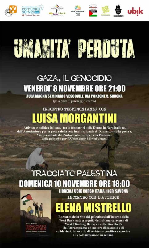 Operazione Colomba, Fondazione Diocesana Comunità Servizi, Officina della Pace e altre associazioni propongono invece due eventi sotto il titolo “Umanità perduta”. Venerdì 8 novembre alle ore 21 nell’aula magna del Seminario Vescovile, in via Leopoldo Ponzone 5 (possibilità di parcheggio interno gratuito), nel quartiere Villetta, si terrà l’incontro testimonianza “Gaza, il genocidio” di Luisa Morgantini, ex vicepresidente del Parlamento Europeo con l’incarico delle politiche per l’Africa e i diritti umani, presidente di AssoPacePalestina e cofondatrice di Donne in Nero, dell’Associazione per la Pace e della rete internazionale di Donne contro la guerra.