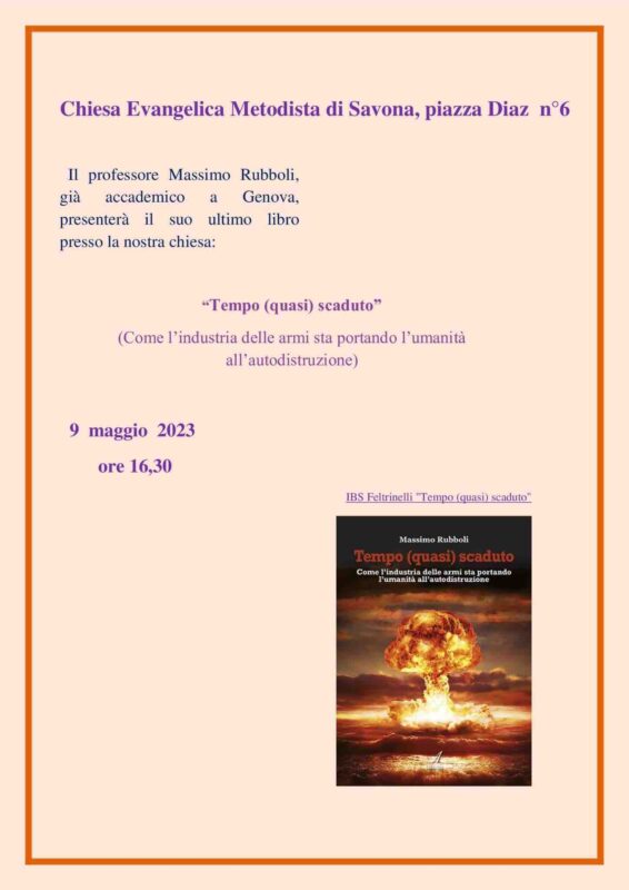 Savona. Martedì 9 maggio alle ore 16:30 presso la Chiesa Evangelica Metodista, in piazza Armando Diaz 6, il professor Massimo Rubboli, già accademico a Genova, presenterà il suo nuovo libro “Tempo (quasi) scaduto – Come l’industria delle armi sta portando l’umanità all’autodistruzione”, edito da Artestampa. Secondo l’autore l’aggressione russa all’Ucraina ha riproposto drammaticamente il problema della guerra e destabilizzato l’ordine geopolitico mondiale, mettendo in evidenza il ruolo dell’industria bellica come fornitrice di armi e fomentatrice di conflitti armati, spesso nascosto dietro retorica bellicista.