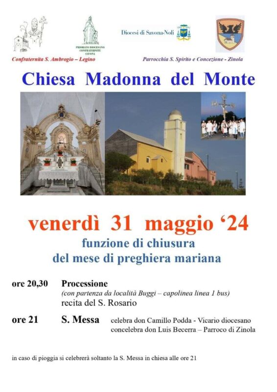 Savona. Venerdì 31 maggio la Confraternita Sant’Ambrogio in Legino e la Parrocchia Santo Spirito e Immacolata Concezione di Zinola celebreranno la chiusura del mese di preghiera mariana con la tradizionale processione alla Chiesa Madonna del Monte.