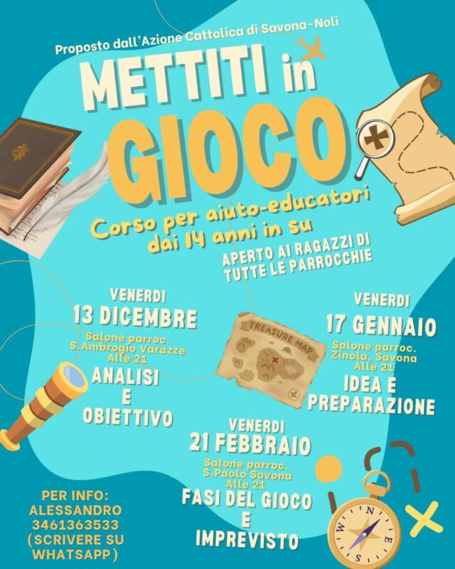 L’Azione Cattolica della diocesi di Savona-Noli propone il corso “Mettiti in gioco” per formare aiuto educatori dai 14 anni in sù e aperto ai ragazzi e alle ragazze di tutte le parrocchie. Gli incontri si terranno mensilmente il venerdì sera alle ore 21.