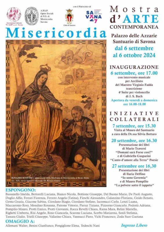Savona. Con il patrocinio del Comune dal 6 settembre al 6 ottobre al Palazzo delle Azzarie, nella frazione Santuario, sarà visitabile la mostra d’arte contemporanea “Misericordia”, promossa dall’Associazione Culturale “Renzo Aiolfi” e da Opere Sociali di N. S. di Misericordia. Ben quarantasei artisti presenteranno le loro iconografie mariane e saranno in esposizione anche preziose e antiche Madonne della Misericordia, come quella in tarsia lignea di Ignazio Scotto.