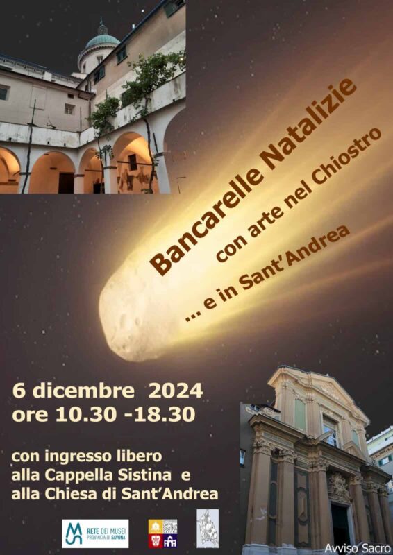 Venerdì 6 dicembre dalle ore 10:30 alle 18:30 a Savona avrà luogo l’evento “Bancarelle Natalizie in Chiostro e… arte in Sant’Andrea”, promosso dal Complesso Museale della Cattedrale e Cappella Sistina e dal Servizio per la Pastorale Scolastica della Diocesi di Savona-Noli. Nel Chiostro Francescano le associazioni impegnate nella cultura e nel sociale, come l’ucraina Pokrova, proporranno tante “idee regalo” ad offerta libera. La Sistina sarà accessibile gratuitamente. Nella Chiesa Sant’Andrea Apostolo sarà esposta un’antica icona di san Nicola. Per informazioni si può telefonare al numero 3270281083 o scrivere un’e-mail a visitasistina@diocesisavona.it.