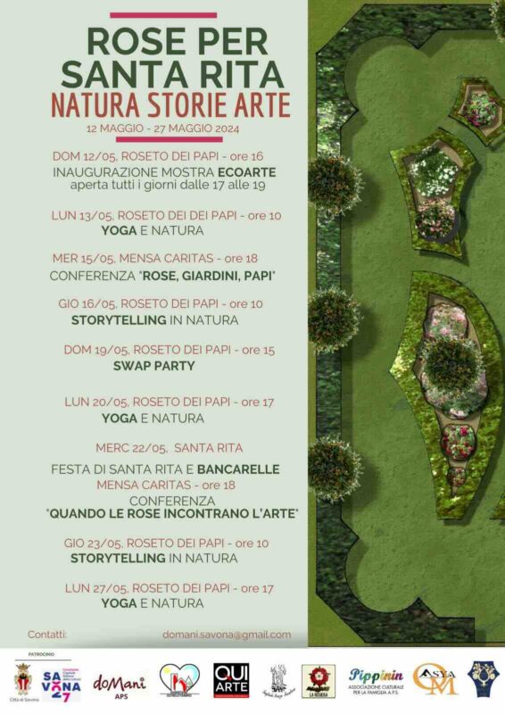 Ancora a Savona domenica 12 maggio alle ore 16 al Roseto dei Papi, in via Bruno Lichene 3, l’associazione doMani e il Condominio Ecologico “Roseto dei Papi” invitano all’inaugurazione della mostra “Ecoarte al Roseto”, in cui oltre venti artisti presenteranno opere ispirate all’ecologia e alla pace. L’esposizione sarà visitabile fino al 27 maggio tutti i giorni dalle 17 alle 19 o su appuntamento chiamando il numero di telefono 3293835607, curata dall’Associazione Pipinin Roseto dei Papi e allestita dall’associazione QuiArte in collaborazione con il Comitato di Quartiere Oltreletimbro e con il patrocinio del Comune.