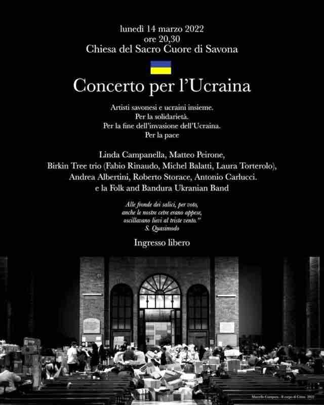 Savona. Lunedì 14 marzo alle ore 20:30 al Sacro Cuore di Gesù, in corso Cristoforo Colombo, si terrà il “Concerto per l’Ucraina”. Si esibiranno Linda Campanella, Matteo Peirone, Birkin Tree (Fabio Rinaudo, Michel Balatti, Laura Torterolo), Andrea Albertini, Roberto Storace, Antonio Carlucci e la Folk and Bandura Ukrainian Band.