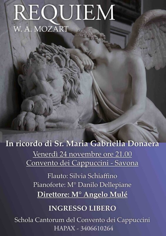 Venerdì 24 novembre alle ore 21 presso il Convento dei Frati Minori Cappuccini, in via san Francesco d’Assisi 16, a Savona la Schola Cantorum Hapax, diretta dal maestro Angelo Mulé, eseguirà la “Messa di Requiem in re minore K626” di Wolfgang Amadeus Mozart in ricordo di suor Maria Gabriella Donaera delle Figlie di Nostra Signora di Misericordia. L’ingresso sarà libero. Per informazioni è possibile chiamare il numero di telefono 3406610264, scrivere un’e-mail a hapax.aps@gmail.com o consultare l’evento su Facebook al link facebook.com/events.