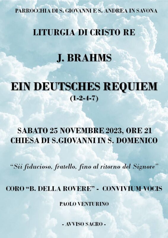 Sabato 25 novembre alle ore 21 nella Chiesa San Giovanni Battista in San Domenico, in via Alfonso Mistrangelo, a Savona il Coro Bartolomeo Della Rovere e Convivium Vocis, diretti dal maestro Paolo Venturino, eseguiranno i brani 1-2-4-7 dell’opera di musica sacra “Ein deutsches Requiem”, composta da Johannes Brahms tra il 1865 e il 1868. L’evento liturgico sarà presieduto dal parroco don Piero Giacosa, il quale ricorderà persone defunte recentemente, tra le quali un giovane cantore del coro, tornato alla “Casa del Padre” dopo un terribile tumore e una lunga sofferenza.