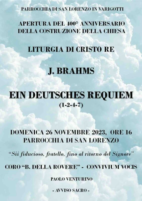 Anche a Finale Ligure, in apertura delle celebrazioni per il quarto centenario della costruzione della Chiesa San Lorenzo Martire, nella frazione Varigotti, domenica 26 novembre alle ore 16 il Coro Della Rovere e Convivium Vocis eseguiranno i suddetti brani dell’“Ein deutsches Requiem”. L’evento liturgico sarà presieduto dal parroco don Domenico Venturetti, il quale interverrà anche con una formula di preghiera del celebrante, partecipata dall’assemblea, destinata ai benefattori che hanno costruito e mantenuto la chiesa e tratta dai testi liturgici della Chiesa Cattolica. Nei prossimi mesi la parrocchiale sarà oggetto di importanti restauri, in particolare il rifacimento della piazza circostante ad opera del Comune.