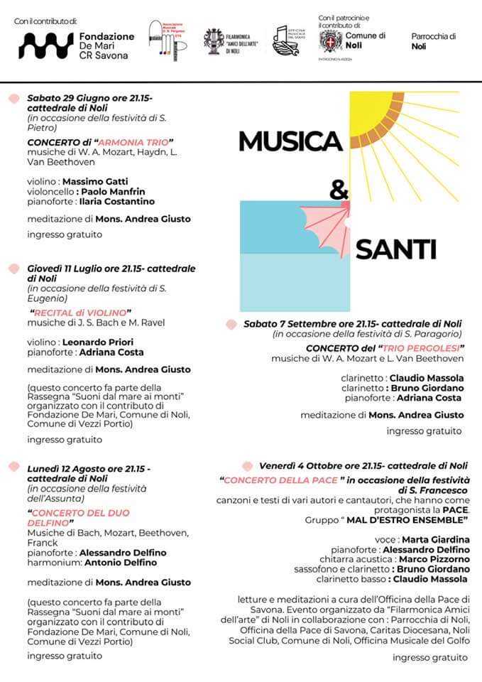 Noli. Con il patrocinio e il contributo del Comune e della Parrocchia San Pietro l’omonima concattedrale barocca ospita la rassegna “Musica & Santi”, con eventi sempre alle ore 21:15 e ad ingresso gratuito. Lunedì 12 agosto in occasione della solennità dell’Assunzione della Beata Vergine Maria l’appuntamento sarà con il “Concerto del Duo Delfino”. Alessandro Delfino al pianoforte e Antonio Delfino al harmonium eseguiranno musiche di Bach, Mozart, Van Beethoven e Franck. Don Andrea Giusto proporrà alcune meditazioni. Il concerto fa parte anche della rassegna “Suoni dal mare ai monti”, organizzata con il contributo della Fondazione De Mari e dei Comuni di Noli e Vezzi Portio.