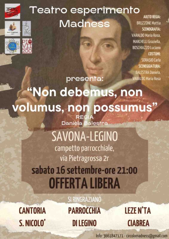 Alle 21 nel campetto della Parrocchia Sant’Ambrogio Vescovo, in via Pietragrossa 2R, nel quartiere Legino, andrà in scena lo spettacolo “Non debemus, non volumus, non possumus” per ricordare il bicentenario della morte di papa Pio VII (20 agosto 1823), la sua figura, la sua presenza nella città della Torretta e la sua attualità. L’opera teatrale sarà replicata dopo il grande successo di pubblico del debutto nel Piazzale del Maschio della fortezza del Priamàr, durante cui sono stati raccolti 1.300 € in favore dell’Emporio della Solidarietà della Caritas diocesana.