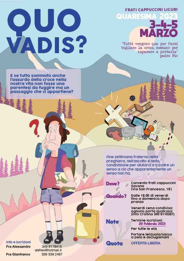 Dal 3 al 5 marzo presso il convento dei Frati Minori Cappuccini, in via san Francesco 16, nel quartiere Villetta, si può essere ospitati per il fine settimana di fraternità nella preghiera, nell’ascolto e nella condivisione “Quo Vadis”. “Lo scopo è aiutarci a trovare un senso a ciò che apparentemente non ce l’ha”, spiegano i religiosi. L’accoglienza sarà alle ore 18 di venerdì e durerà fino a domenica dopo pranzo. Venerdì ci sarà la cena condivisa, in cui ognuno porta qualcosa (per informazioni si può contattare Cristina al numero di cellulare 3409110387). È necessario portare con sè lenzuola o sacco a pelo e asciugamani. Il contributo è ad offerta libera. Per informazioni e iscrizioni si possono contattare frate Alessandro al 3498176415 o all’e-mail alefrec@hotmail.it oppure fra Gianfranco al 3393392467.