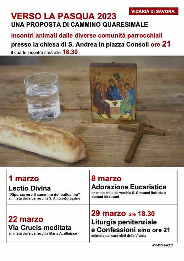 Nel periodo liturgico “forte” di Quaresima in corso diverse realtà ecclesiali della diocesi organizzano alcune iniziative spirituali di comunione, penitenza e conversione. La Vicaria di Savona propone il cammino “Verso la Pasqua 2023”, una serie di incontri animati dalle comunità parrocchiali il mercoledì nella Chiesa Sant’Andrea Apostolo, in piazza dei Consoli. Si inizierà l’1 marzo alle ore 21 con la lectio divina “Ripercorrere il cammino del battesimo”, a cura della Parrocchia Sant’Ambrogio Vescovo in Legino, si proseguirà l’8 marzo alle 21 con l’adorazione eucaristica a cura della comunità San Giovanni Battista e dei diaconi diocesani e il 22 marzo alle 21 con la Via Crucis meditata della Parrocchia Maria Ausiliatrice e si concluderà il 29 marzo alle 18:30 con la liturgia penitenziale e sino alle 21 le confessioni, animate dai sacerdoti della vicaria.