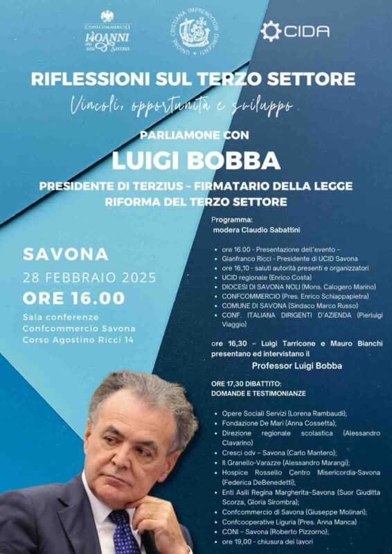 Savona. Venerdì 28 febbraio dalle ore 16 alle 19 nella sala conferenze di Confcommercio, in corso generale Agostino Ricci 14, l’UCID Unione Cristiana Imprenditori e Dirigenti invita al convegno “Riflessioni sul terzo settore. Vincoli, opportunità e sviluppo” con il professor Luigi Bobba, presidente di Terzjus, osservatorio di diritto del terzo settore, della filantropia e dell’impresa sociale, e firmatario della recente legge di riforma del terzo settore.