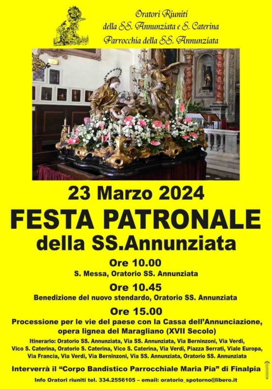 Spotorno. Sabato 23 marzo gli Oratori Riuniti Santissima Annunziata e Santa Caterina e la parrocchia celebreranno la festa patronale della Santissima Annunziata. Si inizierà nell’omonimo oratorio alle ore 10 con la messa e si proseguirà alle 10:45 con la benedizione del nuovo stendardo. Dalle 15 si terrà la processione per le vie cittadine con la “cassa” dell’Annunciazione, opera lignea dello scultore Anton Maria Maragliano, fra i maggiori esponenti della scuola barocca genovese, e risalente al XVII secolo.
