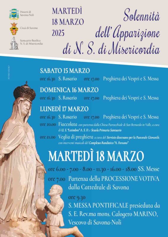 Savona. Nonostante il cielo plumbeo, freddi venti settentrionali e la coincidenza temporale con un giorno feriale (che ha certamente indotto molti residenti a “fare il ponte”) centinaia di fedeli savonesi (comunque in numero minore rispetto agli anni scorsi) hanno celebrato la festa della loro patrona Nostra Signora di Misericordia, nel quattrocentottantanovesimo anniversario (1536) dall’apparizione mariana al contadino e beato Antonio Botta nella valle del Letimbro.