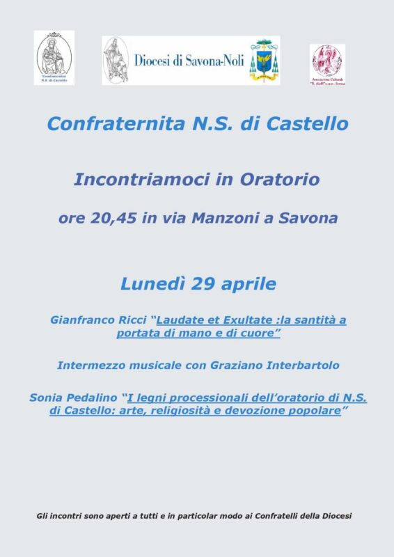 La conferenza chiuderà il miniciclo “Incontriamoci in Oratorio”, organizzato dalla Diocesi di Savona-Noli, dall’Associazione Culturale “Renzo Aiolfi” e dalla Confraternita Nostra Signora di Castello. Graziano Interbartolo curerà l’intermezzo musicale e la priora Sonia Pedalino ci farà scoprire “I legni processionali dell’Oratorio di N.S. di Castello: arte, religiosità e devozione popolare”.