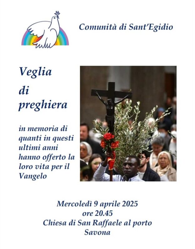 Savona. Mercoledì 9 aprile alle ore 20:45 nella Chiesa San Raffaele al Porto, nella Vecchia Darsena, la Comunità di Sant’Egidio invita alla consueta veglia di preghiera in memoria dei cristiani di ogni confessione che negli ultimi anni hanno dato la vita per testimoniare il Vangelo. La veglia sarà presieduta dal vicario generale diocesano don Camillo Podda.