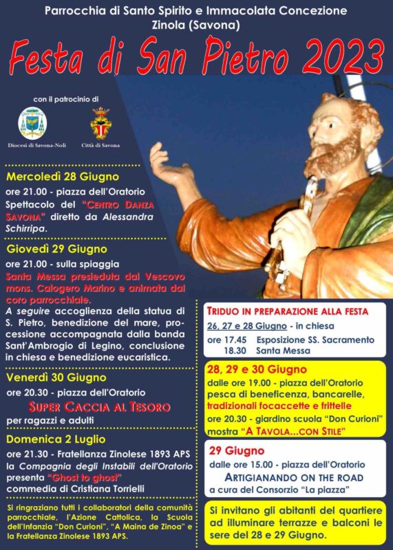 Con il patrocinio della Diocesi di Savona-Noli e del Comune la locale parrocchia organizzerà anche un cartellone di eventi laici. Il 28 giugno alle 21 nella piazza dell’oratorio andrà in scena uno spettacolo del Centro Danza Savona diretto da Alessandra Schirripa, venerdì 30 giugno alle 20:30 nella medesima piazza ci sarà la “Supercaccia al tesoro” per ragazzi e adulti, domenica 2 luglio alle 21:30 alla Società di Mutuo Soccorso Fratellanza Zinolese 1893 la Compagnia degli Instabili dell’Oratorio rappresenterà la commedia “Ghost to ghost” di Cristiana Torrielli.