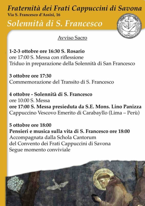 Venerdì 4 ottobre, giorno della memoria liturgica, alle ore 10 e alle 17 saranno celebrate le messe, quest’ultima presieduta dal cappuccino monsignor Lino Mario Panizza Richero, vescovo emerito della Diocesi di Carabayllo (Lima, Perù), originario di Balestrino (Savona). Sabato 5 ottobre alle ore 18 si terrà l’evento “Pensieri e musica sulla vita di S. Francesco”, con l’accompagnamento musicale della Schola Cantorum del convento. Seguirà un momento conviviale.