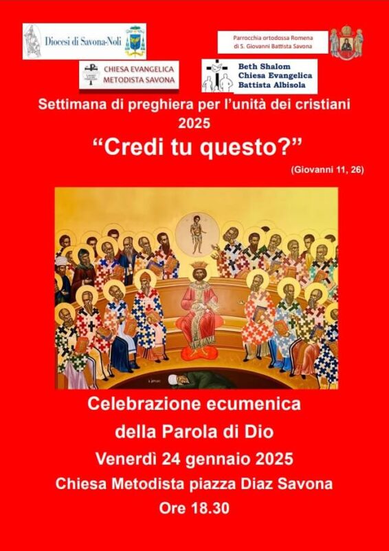 Alle 18:30 nella Chiesa Evangelica Metodista, in piazza Armando Diaz, il vescovo parteciperà alla celebrazione ecumenica della Parola di Dio “Credi tu questo? (Giovanni 11, 26)” per la Settimana di preghiera per l’unità dei cristiani insieme ai rappresentanti della Chiesa Evangelica Metodista, di quella evangelica battista di Albisola e della Parrocchia ortodossa romena San Giovanni Battista.
