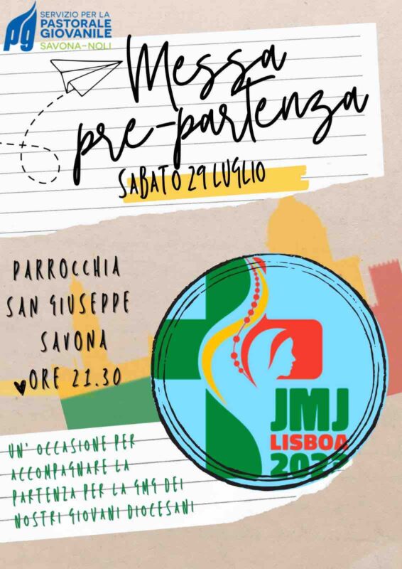 Savona. Sabato 29 luglio alle ore 21:30 nella Chiesa San Giuseppe, nel quartiere Oltreletimbro, monsignor Calogero Marino presiederà una messa per la partenza dei ragazzi che parteciperanno alla XXXVIII Giornata Mondiale della Gioventù a Lisbona, in Portogallo, sul tema “Maria si alzò e andò in fretta (Lc 1, 39)”. Sono invitati tutti coloro che vogliono accompagnare con la preghiera i novanta pellegrini di età compresa fra i 14 e i 30 anni e che partiranno alla volta del Portogallo.
